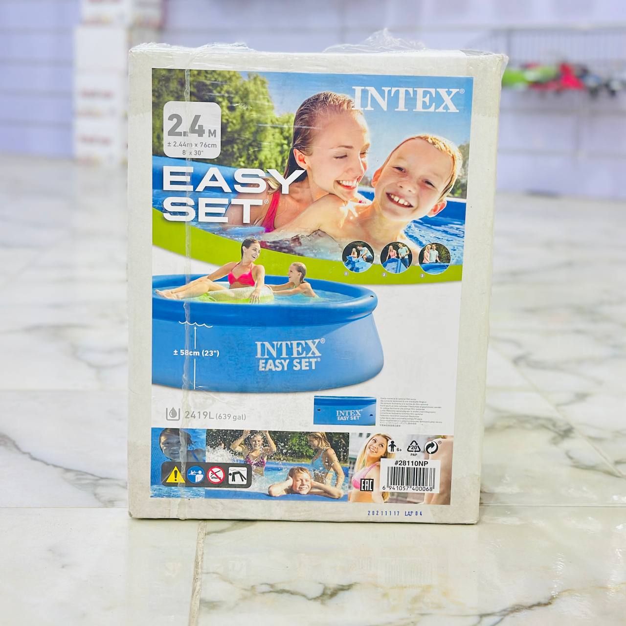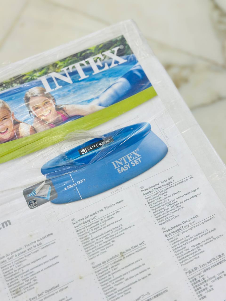 - حوض INTEX EASY SET – 2.44 متربقطر يبلغ 2.44 متر وارتفاع 58 سم تعبئة الماء ، ارتفاع الحوض كامل 76 سانتي ، هذا الحوض المثالي للعائلات يوفر طريقة رائعة للاسترخاء واللعب في الماء.