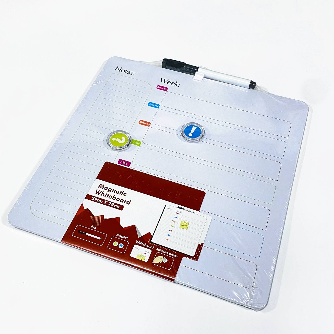 سبورة بيضاء مع تسطير ايام الاسبوع وملاحظات مع خطاط ومغناطيس