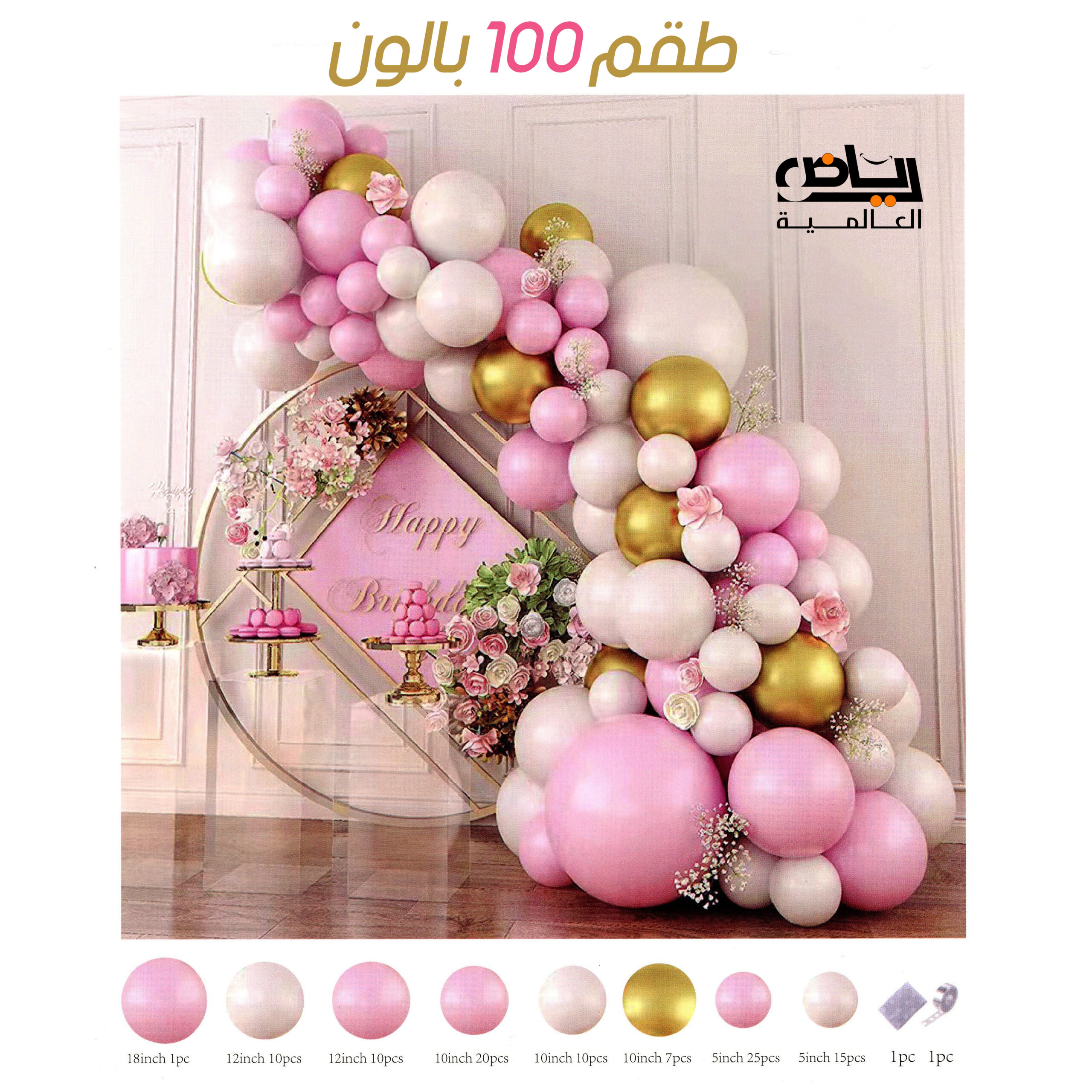 • طقم به 100 قطعه 98 بالون وشريط ربط البالونات ولصق دبل فيس لـ لصق الفراغات بعد تكملة السرب