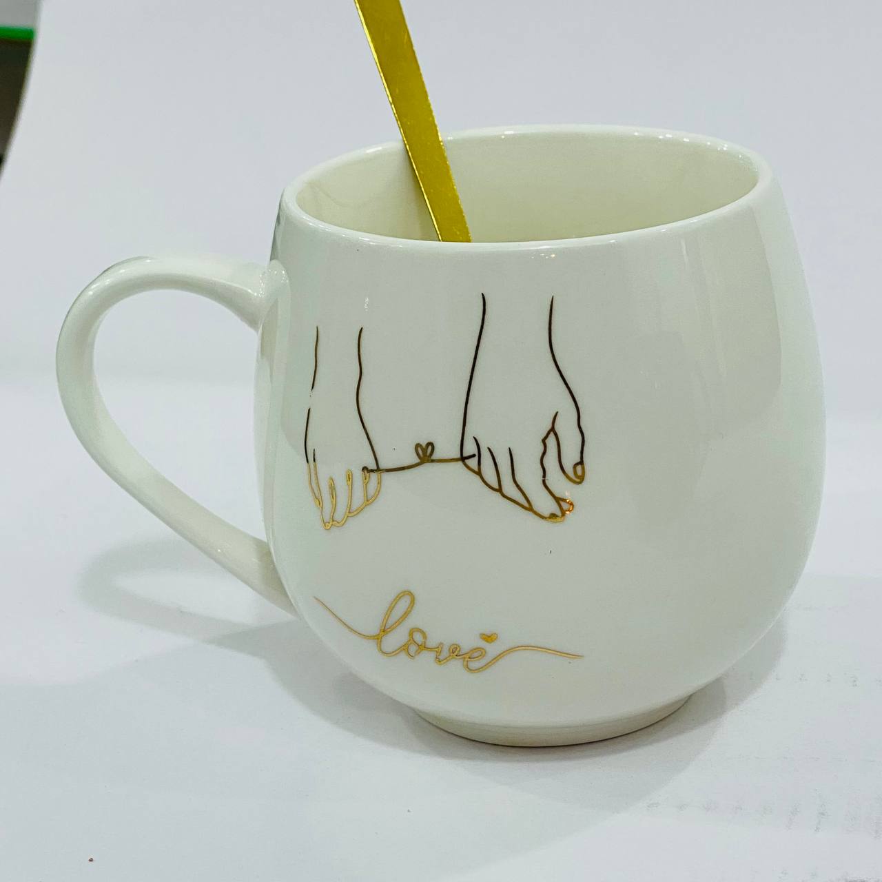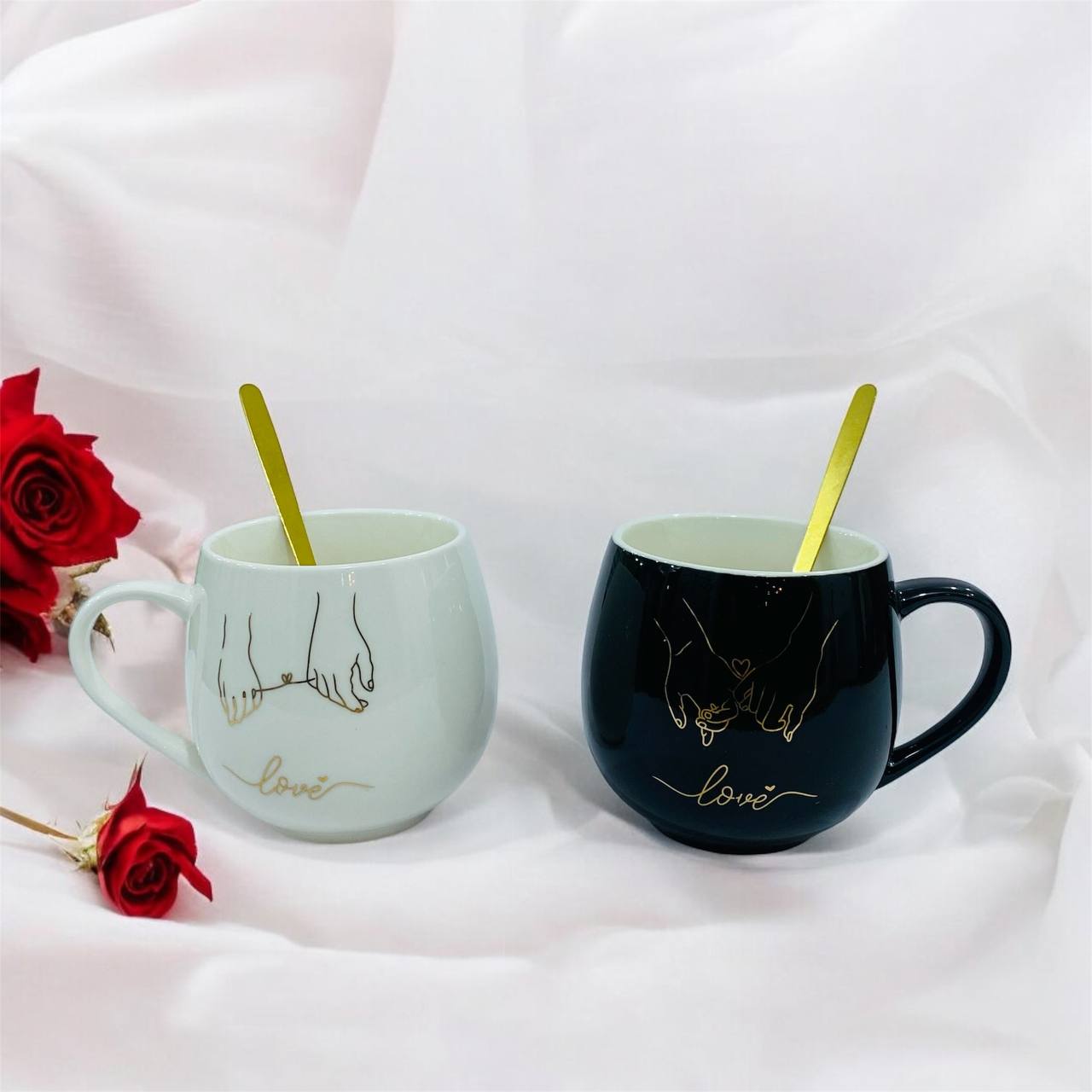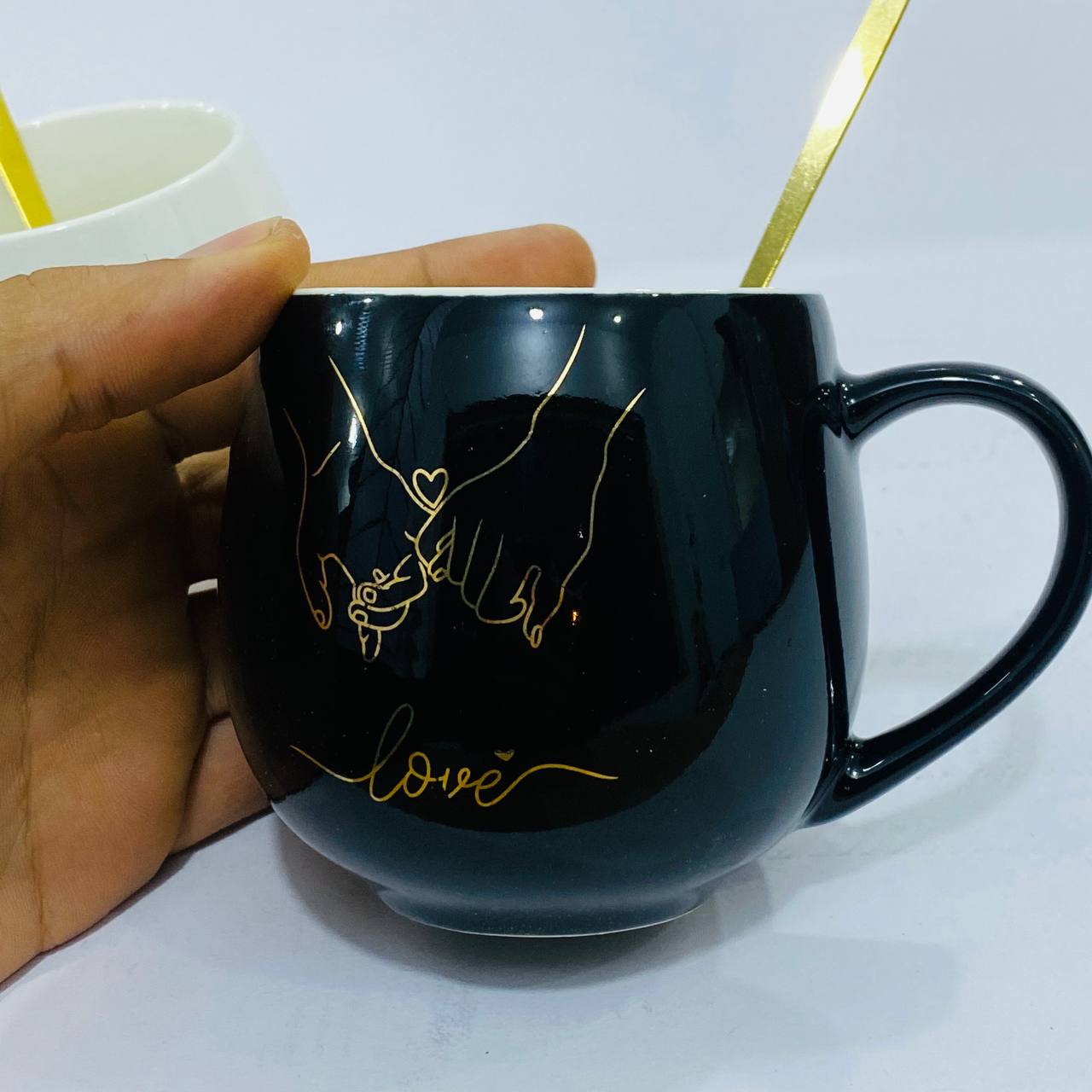 طقم 2 مق كابتشينو فخم برسمه الأصابع اللامعه مع عبارة love هدية زوجين داخل علبه , مناسبة لافطار صباحي وديكور منزل
