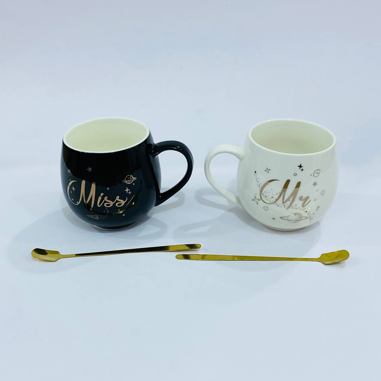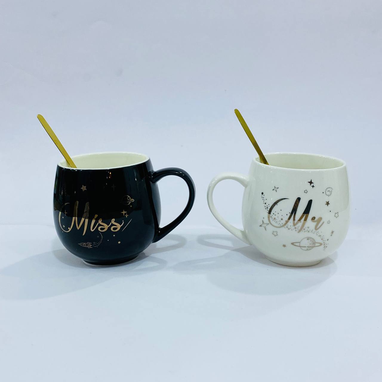 طقم 2 مق كابتشينو فخم بكتابة Miss & Mr هدية زوجين داخل علبه افطار صباحي وديكور منزل