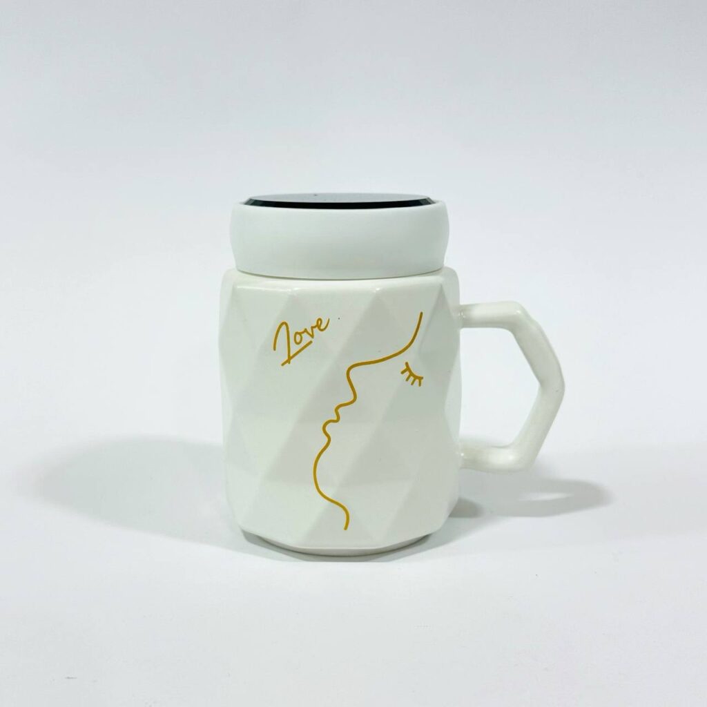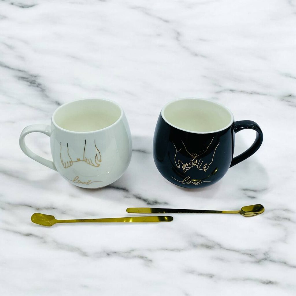 طقم 2 مق كابتشينو فخم برسمه الأصابع اللامعه مع عبارة love هدية زوجين داخل علبه , مناسبة لافطار صباحي وديكور منزل