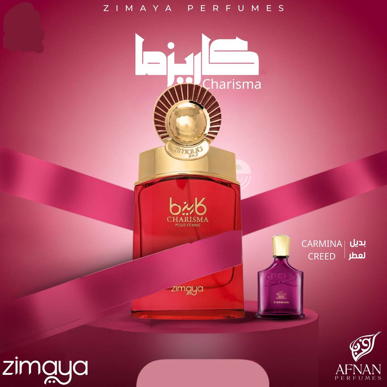 - عطر كاريزما بور فام (Charisma Pour Femme) من علامة Zimaya، وهو عطر مميز للسيدات بتصميم فاخر وأنيق.