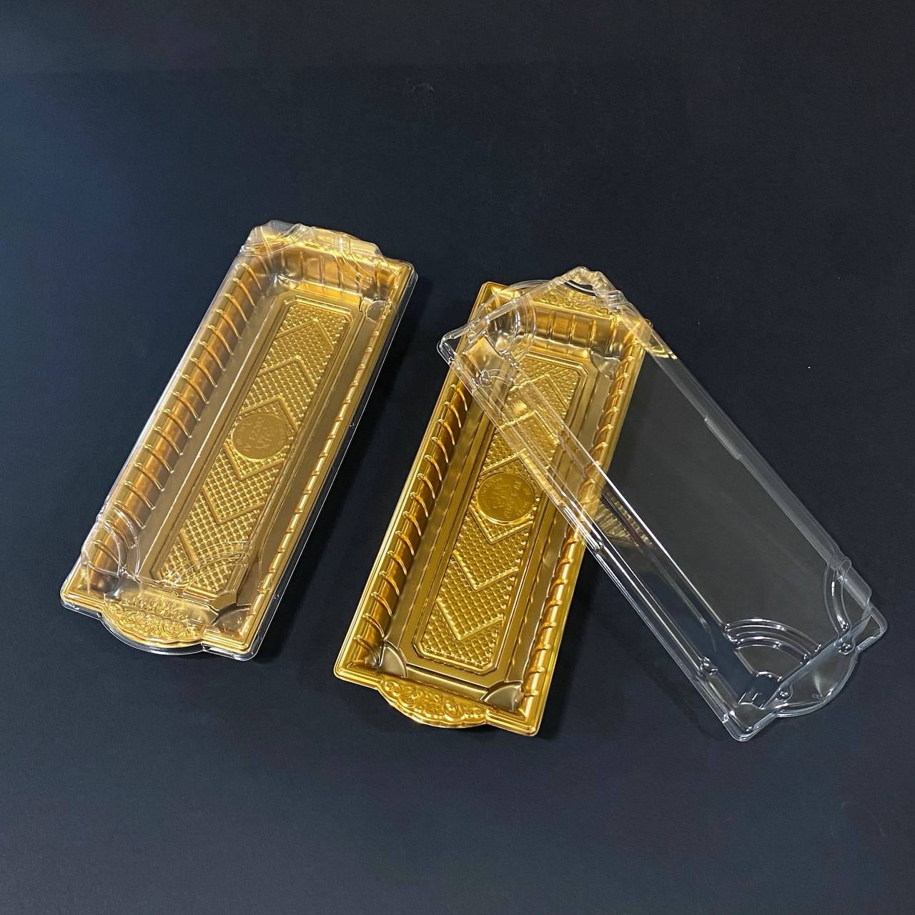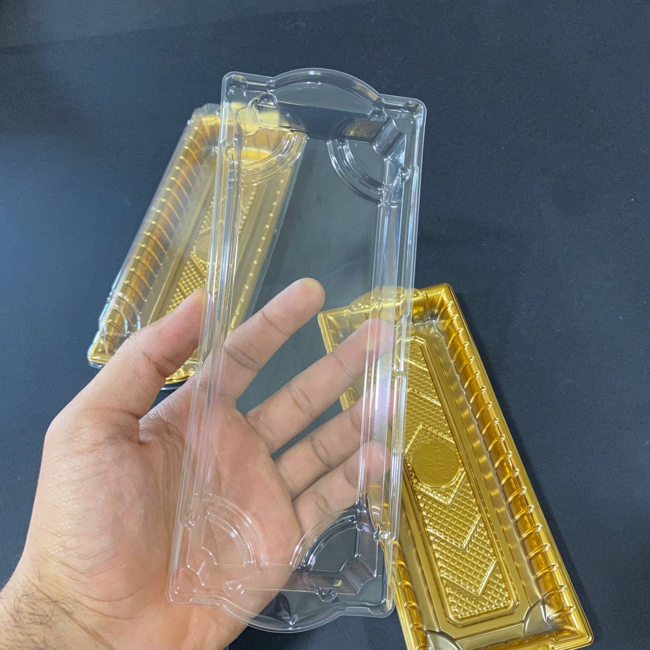 علبة فاخرة فارغه بلاستيك ذهبية متعددة الاستعمالات بغطاء شفاف للاستعمال الغذائي والكيكات