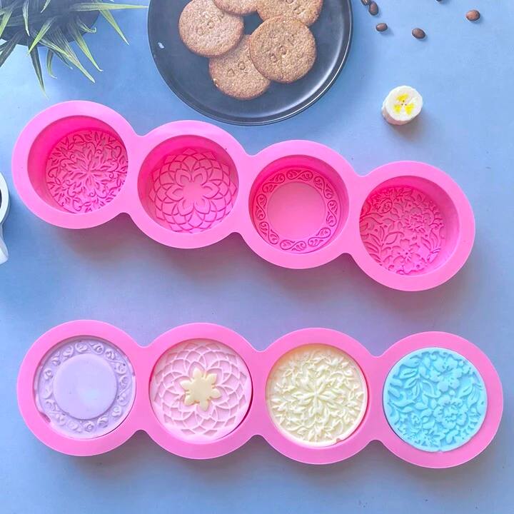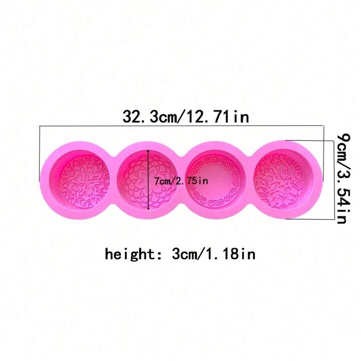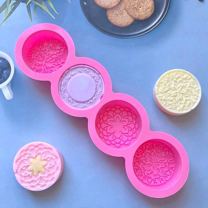 - قالب سيليكون مصنوع يدويًا ذو تصميم ثلاثي الأبعاد ب- 4 حفر دائري بتصميم زهري، قالب DIY للشمع والصابون