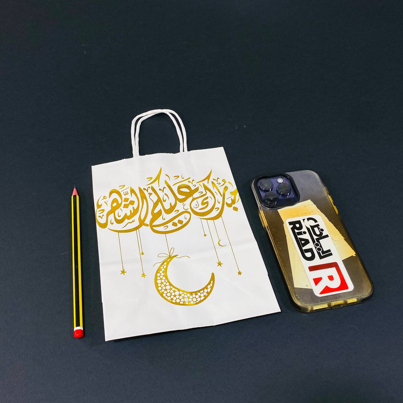 كيس هدايا ورقي ابيض بعبارة ذهبية مبارك عليكم الشهر مع هلال رمضان