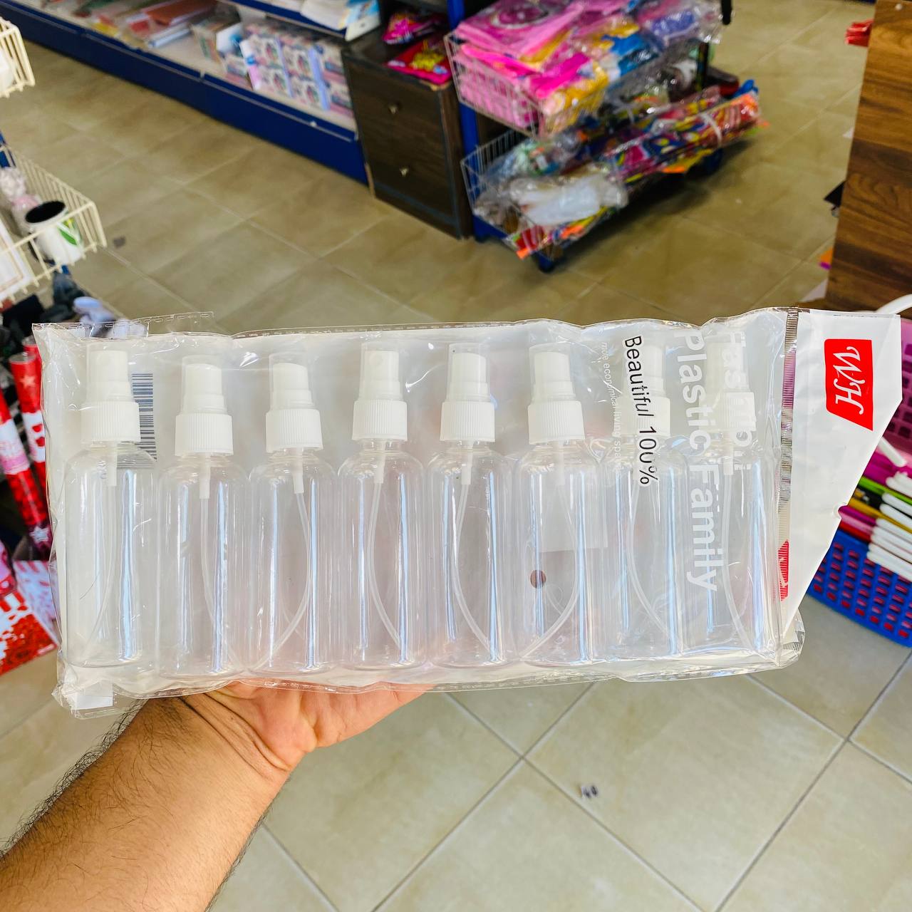 - هذه الصورة تُظهر مجموعة من عبوات الرش الفارغة الشفافة ذات حجم صغير (غالبًا ما تكون سعة كل عبوة حوالي 50-100 مل)، مزودة برذاذ بخاخ أبيض، ومعبأة في كيس بلاستيكي مخصص للبيع بالجملة أو العائلي.