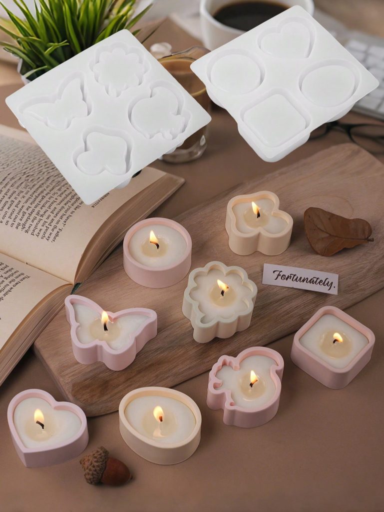 قالب سيلكون بتفاصيل غير منتظمة 4 تجاويف اشكال قلب وفراشة ومربع ودائري لصنع مجسمات الجبس وعلب لشمع المعطر WFHM77